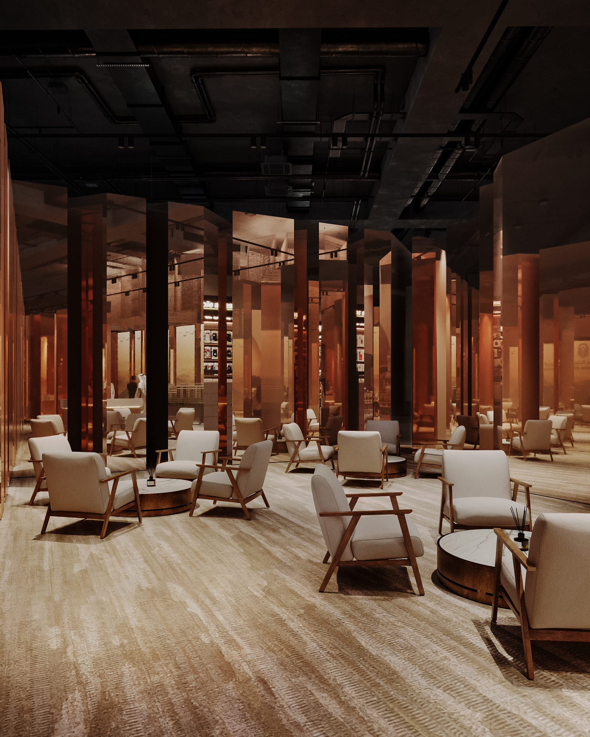 We designed the booth by deconstructing the company’s logo to create the form of the columns that define its boundaries, incorporating mirrored elements to capture movement and spark curiosity as visitors pass by. The entrance was emphasized with a striking hammered-copper finish, forming a bold architectural arch that reinforces the brand identity. Inside, the layout features distinct zones: a grand introduction area showcasing the company’s mega project, a VIP networking space on the right, and a dedicated sales and meeting section on the left.